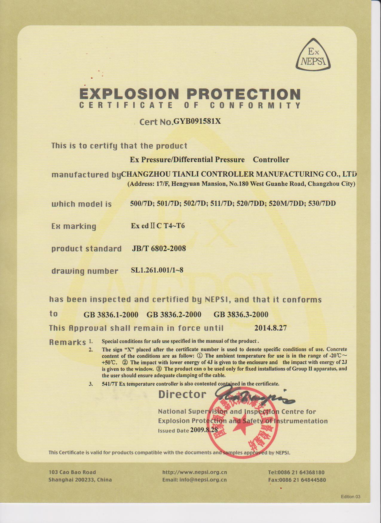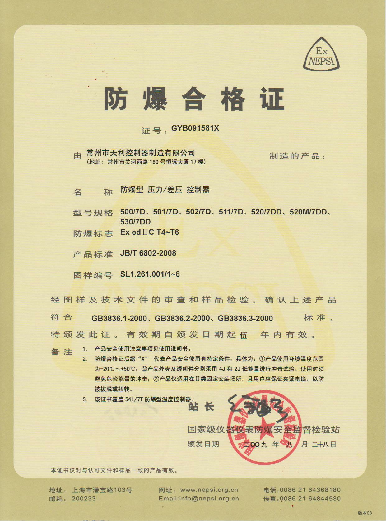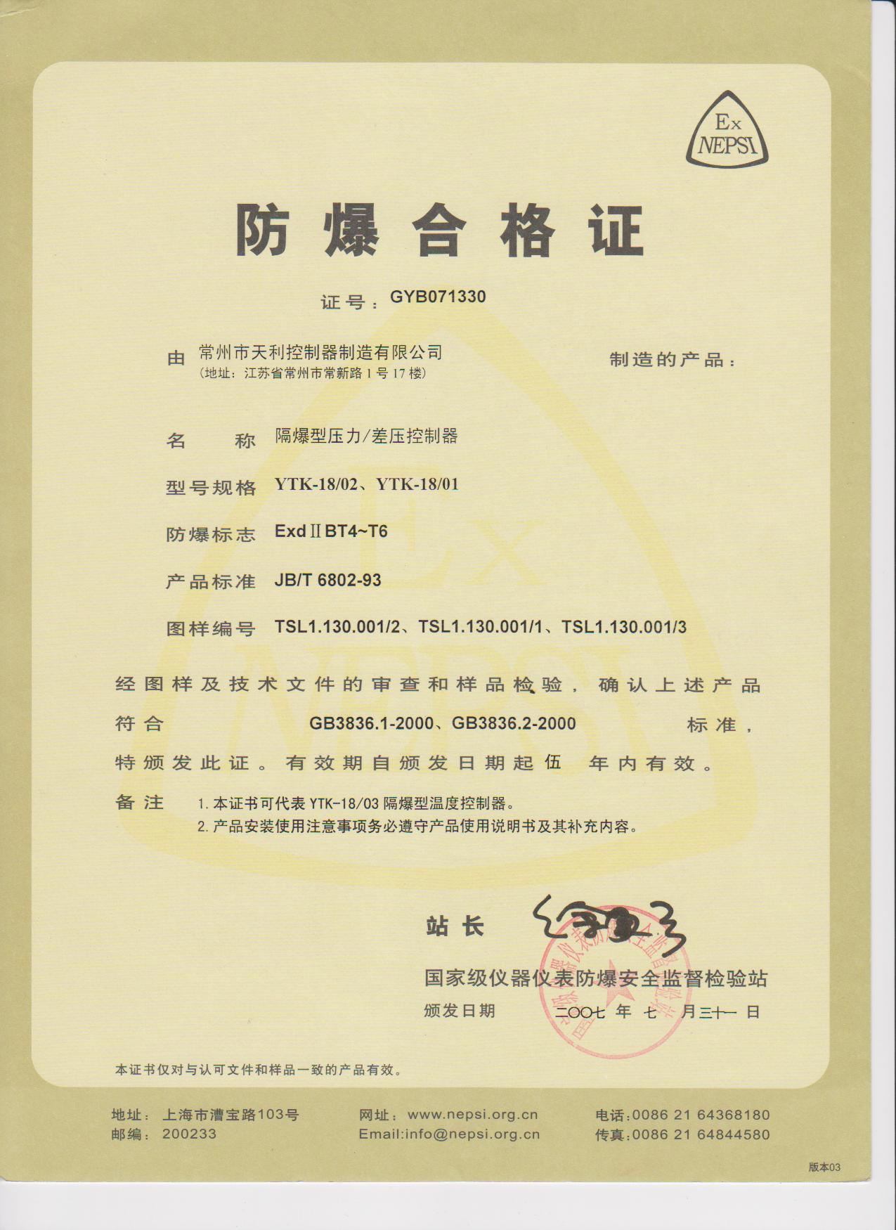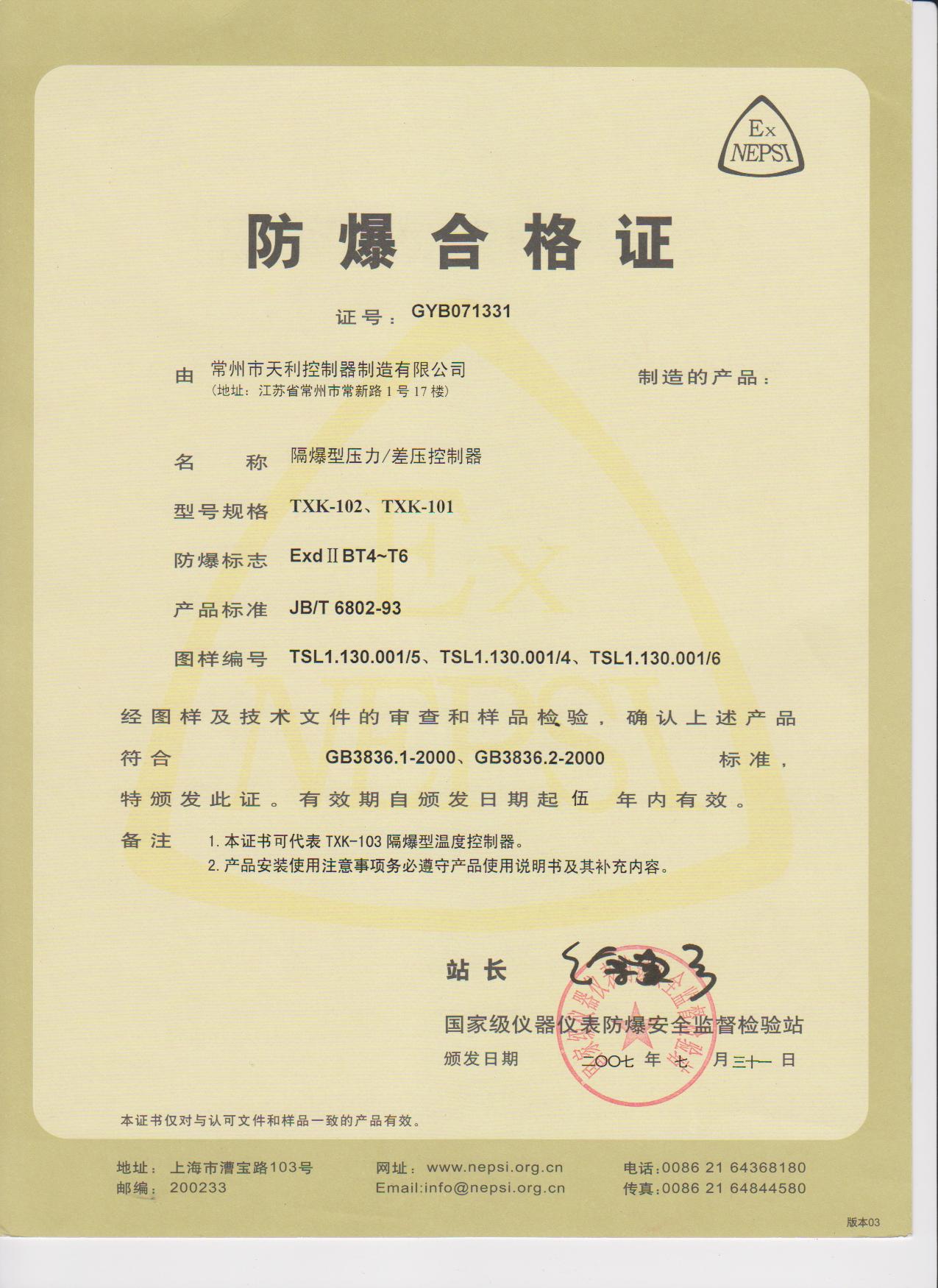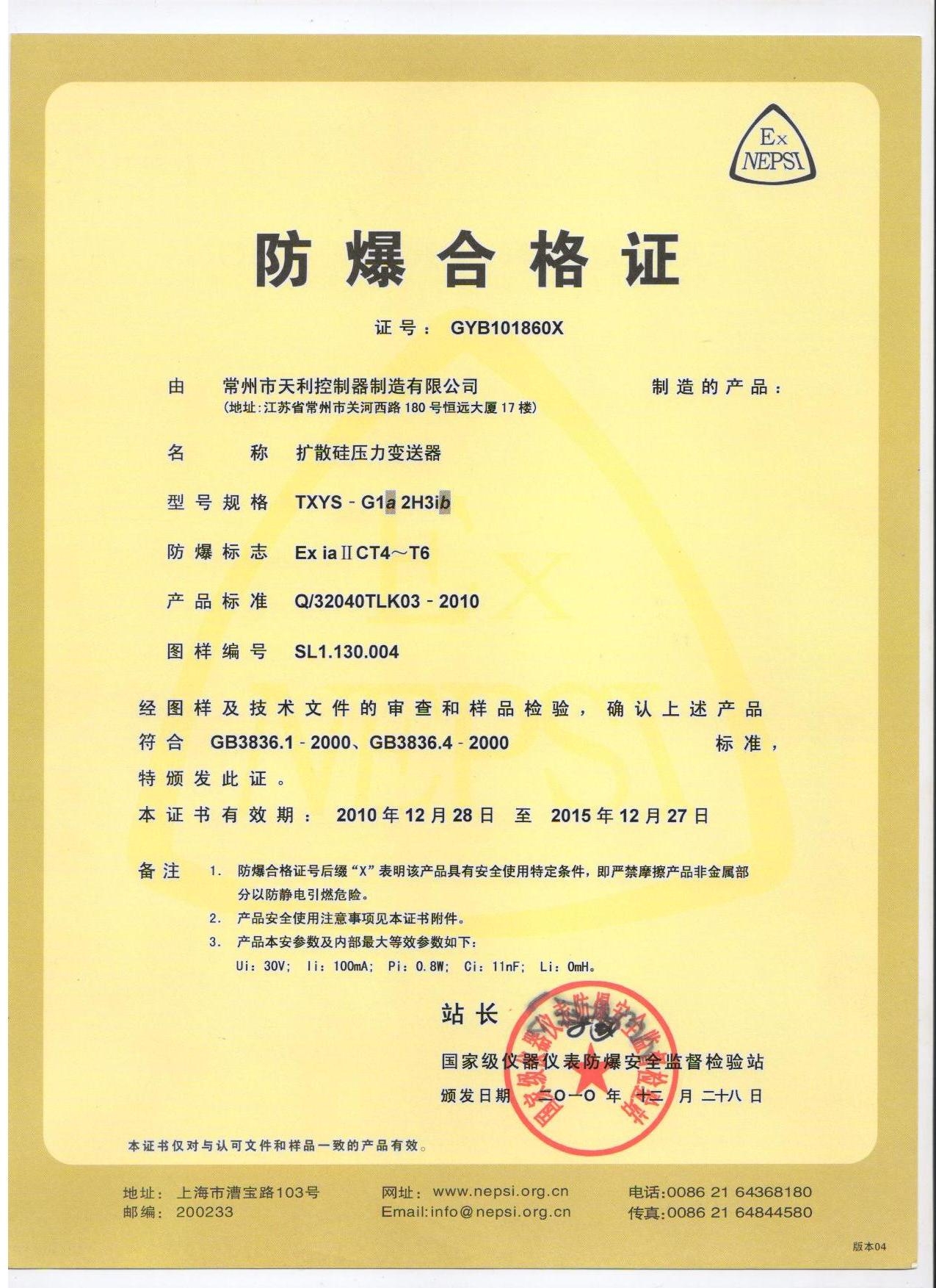 天利控制器天祥牌防爆壓力控制器各類資質證書: